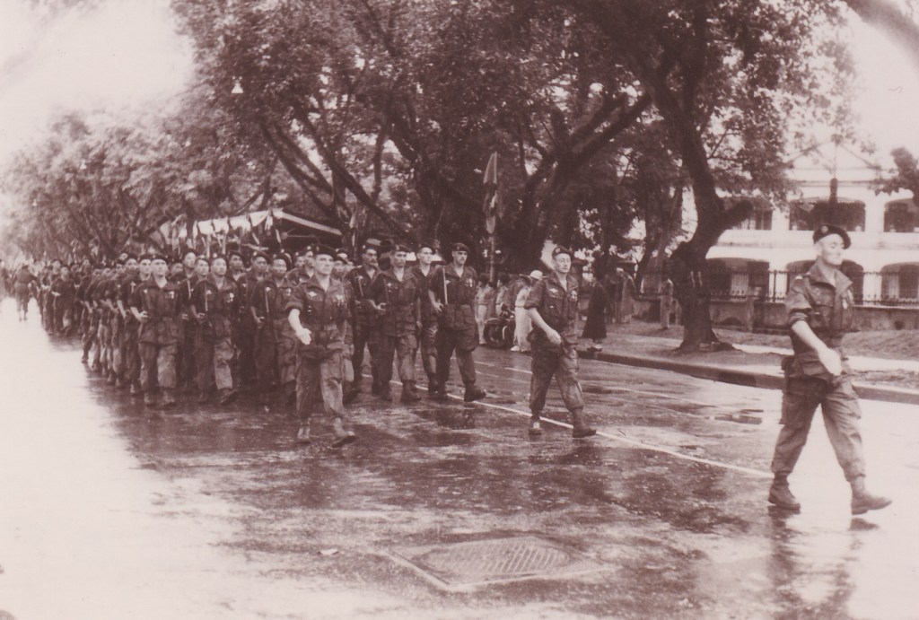 Le lieutenant Periou en tête de sa compagnie lors du défilé du 11 novembre 1953,