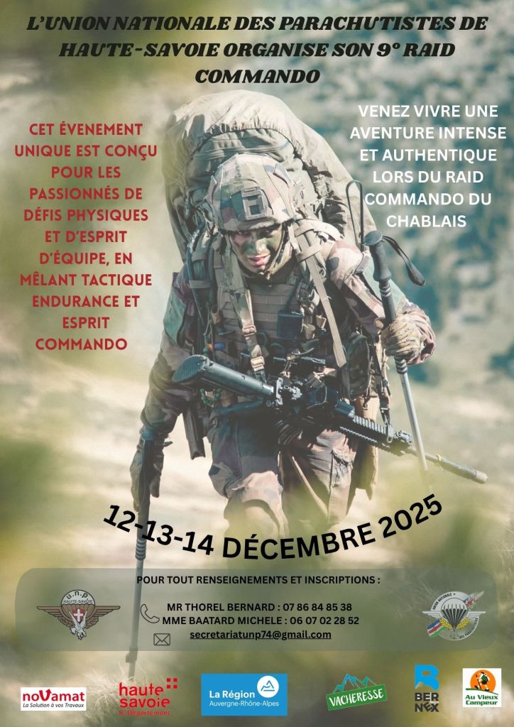 Ce Raid est organisé par la section Haute-Savoie de l’Union Nationale des Parachutistes, reconnue d’utilité publique par décret du journal officiel du 19 septembre 1978 déclaré en préfecture. Notre association regroupe les anciens des troupes d’élite de l’armée française, anciens parachutistes métropolitains, des troupes de marine, les commandos de l’air, marine, les gendarmes parachutistes.