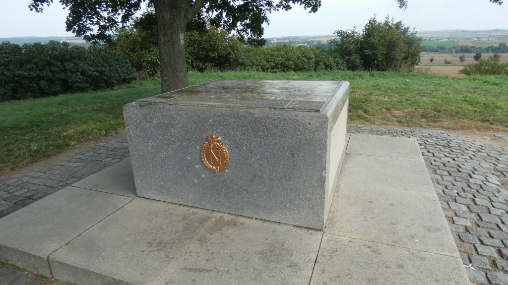Son sommet est occupé par deux érables mais aussi par un bloc en granit avec la carte en relief du champ de bataille qui met en évidence le mouvement des troupes. On y voit gravé dans la pierre et en français la déclaration de Napoléon avant la bataille : « Soldats, je dirigerai moi-même tous vos bataillons, je me tiendrai loin du feu, si, avec votre bravoure accoutumée, vous portez désordre et la confusion dans les rangs ennemis, mais, si la victoire était un moment incertaine, vous verriez votre Empereur s’exposer aux premiers coups, car la victoire ne saurait hésiter, dans cette journée surtout où il y va de l’honneur de l’infanterie française, qui importe tant à l’honneur de toute la nation. » Quel est le chef politique de nos jours qui ferait une déclaration d’une telle grandeur d’esprit?