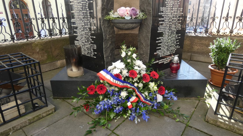 Notre guide-interprète Hana nous accueille à l’aéroport pour nous amener à l’hôtel **** Expo, situé à côté du parc des expositions Vystaviste de Prague, où nous sommes accueillis au son d’un accordéon joué par le mari de Hana et où nous attend un petit casse-croûte pour nous donner du cœur au ventre avant de repartir en tram -les transports en commun sont gratuits à Prague pour les retraités- à destination de la Cathédrale Saints-Cyrille-et-Méthode, une cathédrale orthodoxe du centre de Prague, appelée ainsi en l’honneur de Saint Cyrille et de Saint Méthode, deux frères nés en Grèce, considérés comme les évangélisateurs de l’Europe centrale. Le 24 septembre 1941, Adolf Hitler nomme Reinhard Heydrich adjoint du gouverneur du protectorat de Bohême-Moravie. Promu SS-Obergruppenführer und General der Polizei, ce dernier devient rapidement le « numéro un ». Le 27 mai 1942 vers 10h35, sans escorte ni protection particulière, installé à côté de son chauffeur sur le siège avant d’un cabriolet décapoté, Heydrich se dirige vers ses bureaux au centre de Prague. Trois parachutistes tchécoslovaques, tous parachutés dans la nuit du 28 au 29 décembre 1941 en provenance d’Angleterre, sont placés en embuscade et l’attaquent. Heydrich succombera à cette attaque. Les parachutistes et d’autres membres de la Résistance, après quelques péripéties, se réfugient dans la crypte de l’église Saints-Cyrille-et-Méthode. Ils sont trahis. Le 18 juin, à 4h15 du matin, l’église est encerclée par les soldats allemands. Une véritable bataille de siège s’engage. Les assiégés, après une résistance farouche, périssent finalement dans les combats ou sont blessés puis se donnent la mort. Nous leur rendons hommage en déposant une gerbe devant le Monument aux Morts de la Résistance placé devant l’église, avant d’écouter les explications de la responsable et de visiter les lieux.